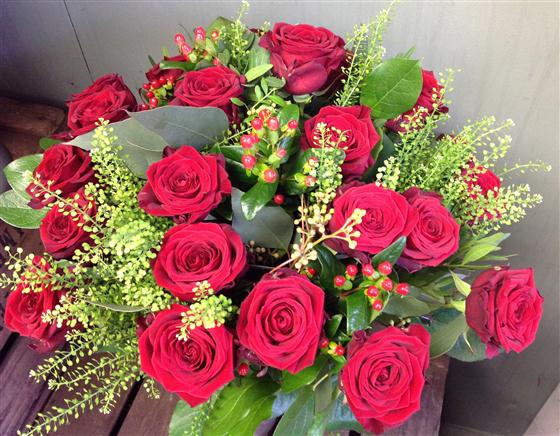 Two dozen top quality velvety red roses interspersed with berries and thalaspi foliage. The best you can buy!